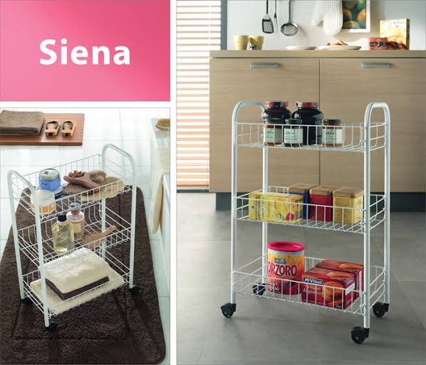 Dans le chariot de cuisine avec 3 paniers Siena de la marque Metaltex, vous pouvez ranger toutes sortes de choses, comme nourriture, boissons et produits de nettoyage.
