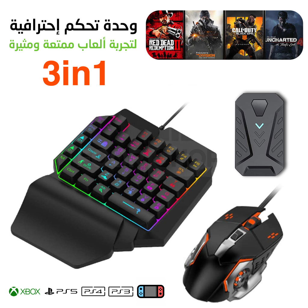 تريد تحكما جيدا وكسب الجميع في ألعاب الفيديو؟ نقدم لك طقم أجهزة التحكم 3في1 المثالي لألعاب الفيديو كـ Pubg وFortnite، مكون من ماوس ولوحة مفاتيح احترافيين خاصين بالألعاب، مع محول أو وصلة متعددة المنافذ للربط بين أجهزة التحكم والمنصة، تصميم مبتكر متوافق مع مختلف المنصات كالبلايستيشن، الإكس بوكس والنينتيندو سويتش.