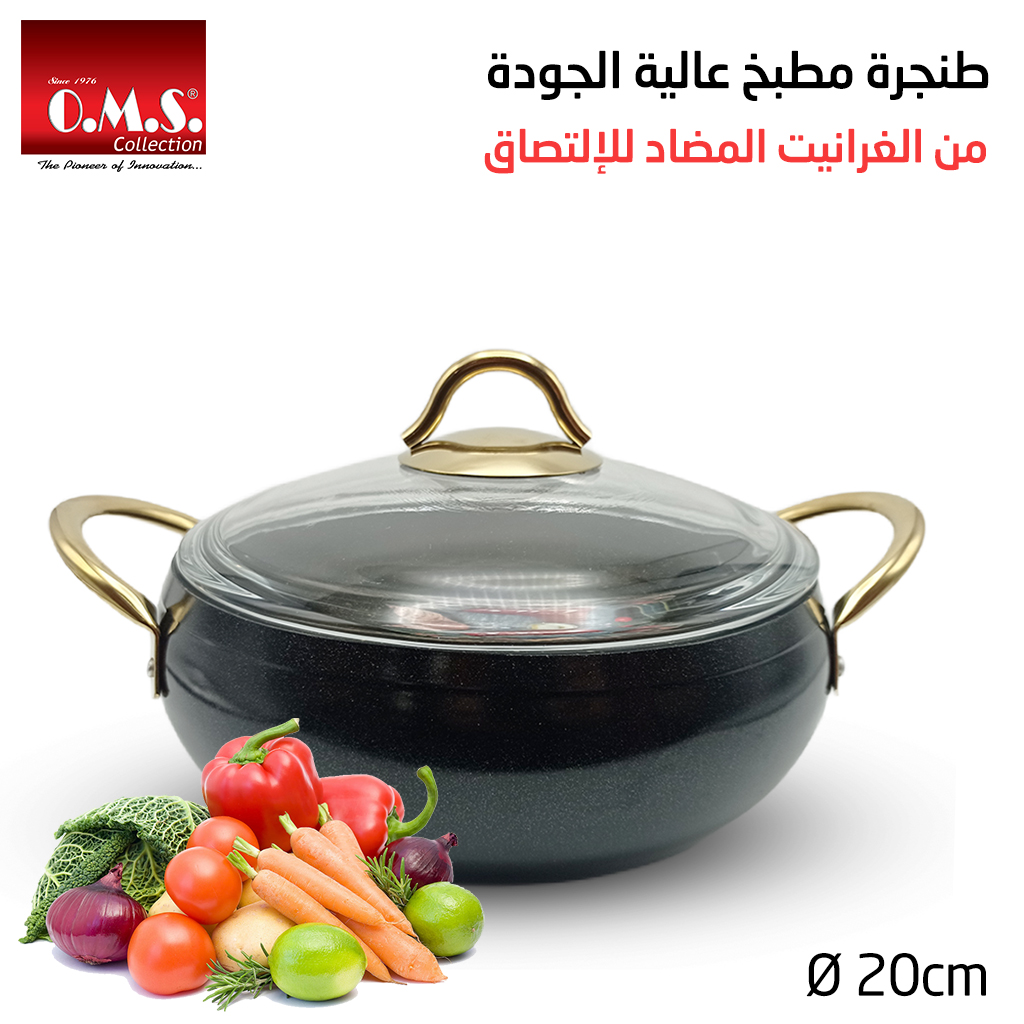طنجرة طبخ من الألمنيوم بطبقة من الغرانيت مع غطاء زجاجي مضادة للإلتصاق OMS Casserole en Granite Anti-adhésive Avec Couvercle en Verre 20cm