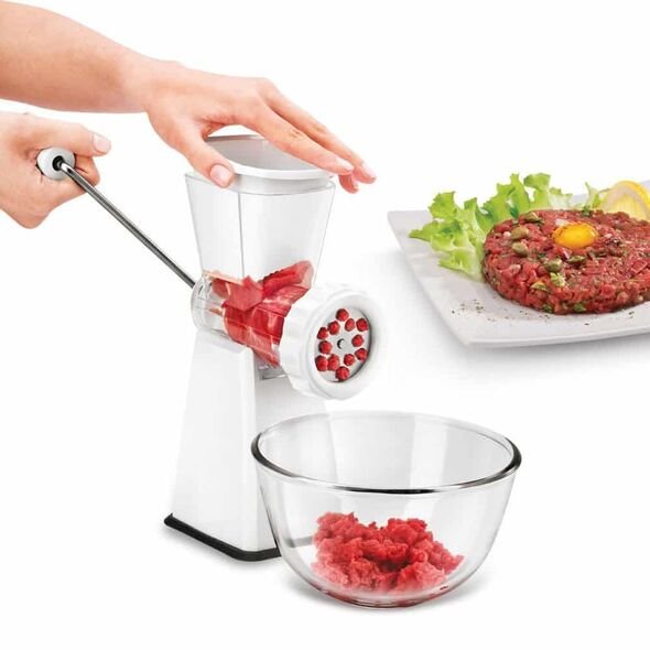 مفرمة اللحم مع مرفقات خاصة لتشكيل وتزيين العجين تحتوي على قرصين من الصلب المعالج لفرم اللحوم والمكسرات والخضروات بالاضافة الى مكبس لعمل العجائن والمقرمشات و المعكرونة . مع قاعدة شافطة للتثبيت باحكام على الأسطح المستوية وظاغط أمام للاستخدام الآمن. استخدام TARTAR من بسيط للغاية، وبفضل كوب الشفط الكبير، فإنه يعلق بسرعة على جميع الأسطح الملساء. يمكنه فرم أي شيء يسكب بدااخله ، لحم مكسرات عجين : أعشاب وغيرها الكثير، يمكنك تفكيكه بالكامل من أجل غسله بسهولة. نصيحة: الساعد قابل للإزالة ، لتوفير مساحة أثناء التخزين.